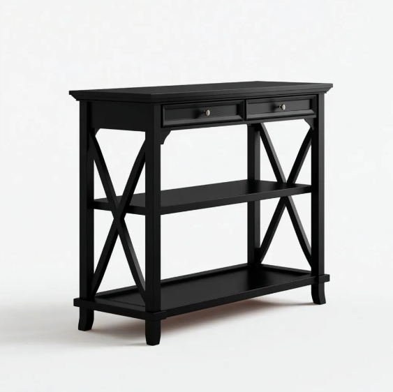Console avec 2 tiroirs et étagères en bois d’hévéa noir