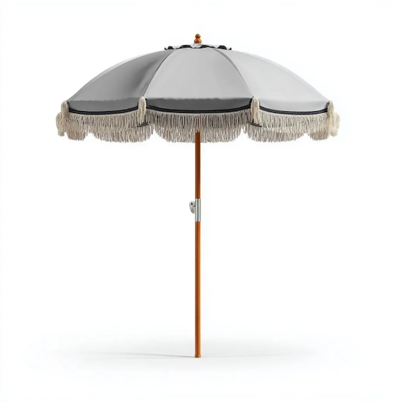 Parasol droit de jardin gris avec franges en tissu polyester et mât en bois